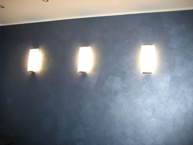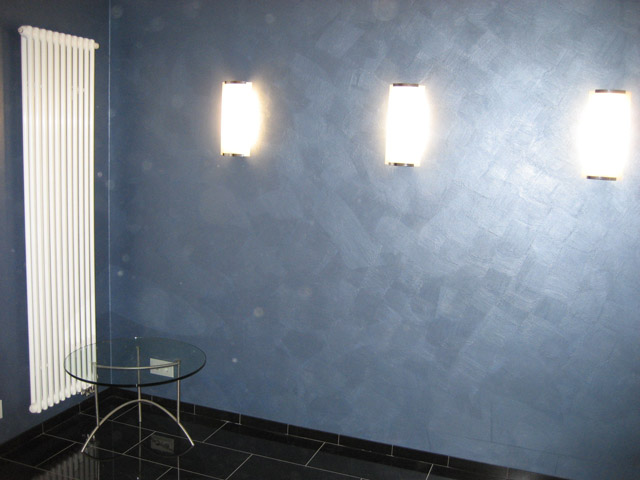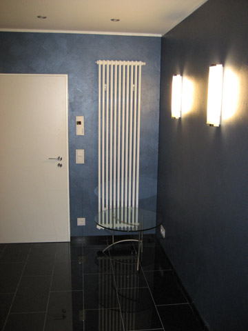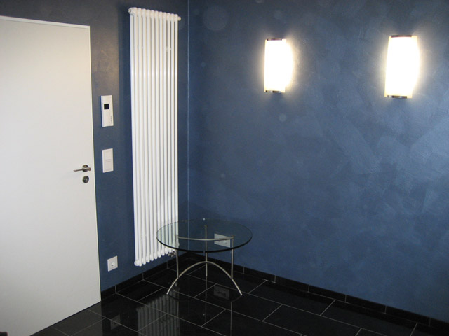 Trockenbau mit Spachtelarbeiten und Deckenabhängung mit Einbaustrahlern. Hochglanzpolierte Natursteinfußboden verlegt und verfugt.