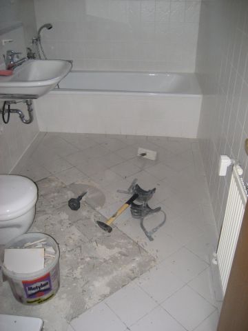 Sanierung eines Bades, Herausstemmen der alten Bodenbeläge.