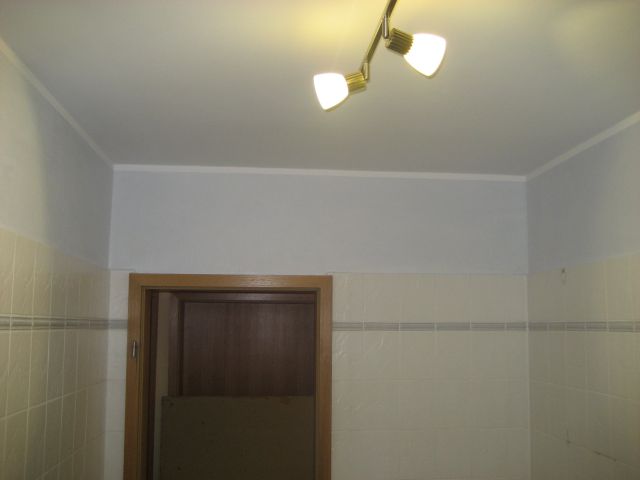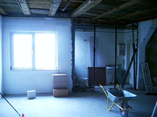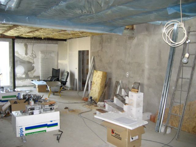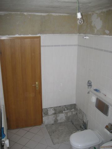 Badsanierung im Altbau, Fliesenabstemmen und Wände gerade verputzen.