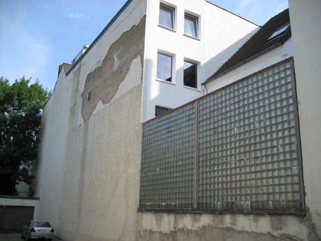Alte Fassade mit porösem und aufgeplatzem Putz.