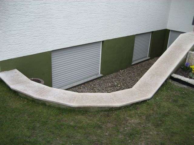 Mauerabdeckung wird nach Maß mit Granitplatten versehen. Granitplatten wurden vor Ort zugeschnitten.